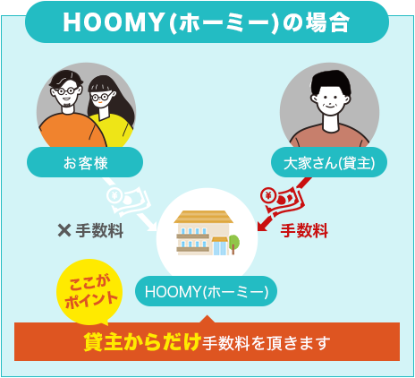 ですがHOOMY(ホーミー)では物件オーナー様から手数料の出る物件に関しては、お客様の手数料0円でご紹介致します。